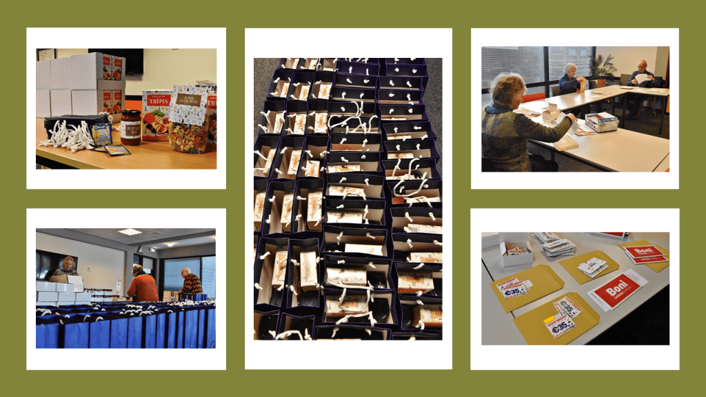 Tasjes worden klaargemaakt met levensmiddelen en waardebonnen