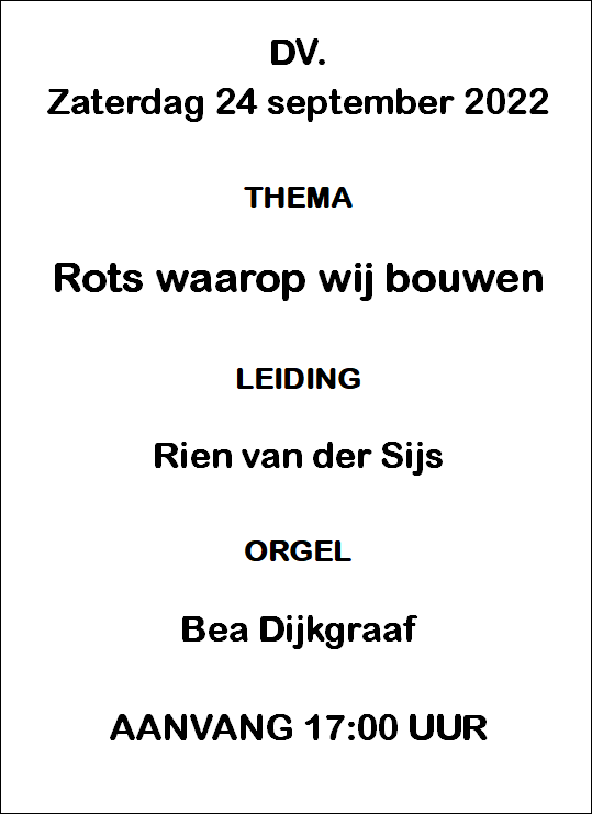 Het eerstvolgende zanguur is op DV 24 september (altijd de laatste zaterdag van de maand). In december is er vanwege oudejaarsavond géén Joh. de Heer dienst!