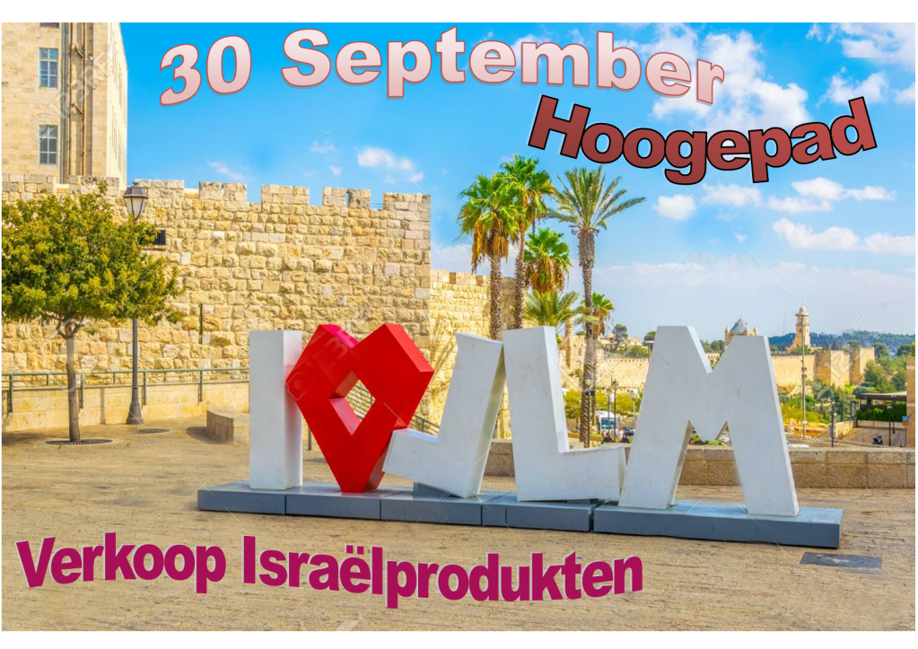 Daarom staan we op 30 september in Het Hoogepad met de Israëlproducten. Van 10.00 tot 17.00 uur. Het is een jubileum jaar: Israël bestaat 75 jaar!! Feliciteer hen!! Komt u kijken, proeven en kopen? Zo kunt ook u naast Israël staan!!