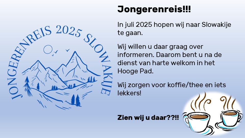 Kom dus allen na de dienst naar het Hooge Pad voor een gezellig samenzijn en om te luisteren naar de plannen voor de Jongerenreis 2025.