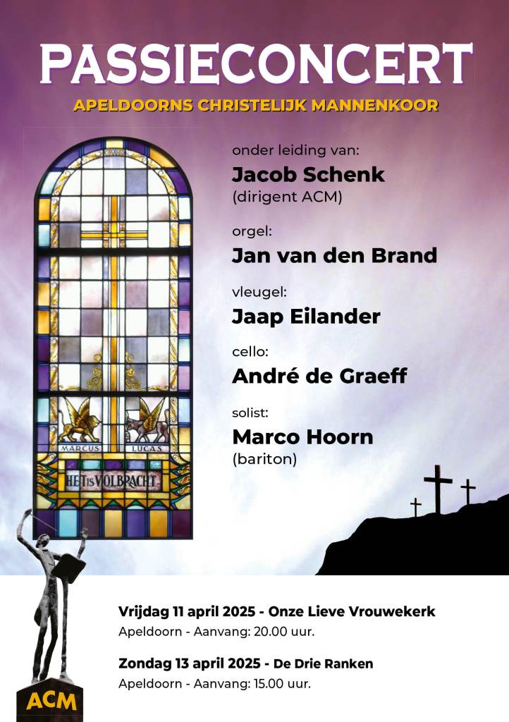 Het Apeldoorns Christelijk Mannenkoor geeft traditiegetrouw haar Passieconcerten in de lijdensweken voorafgaand aan Pasen. Onze bezoekers vinden het fijn om een keuze te kunnen maken om het concert in de avond of in de middaguren te willen bezoeken. Het ACM biedt u deze mogelijkheid.